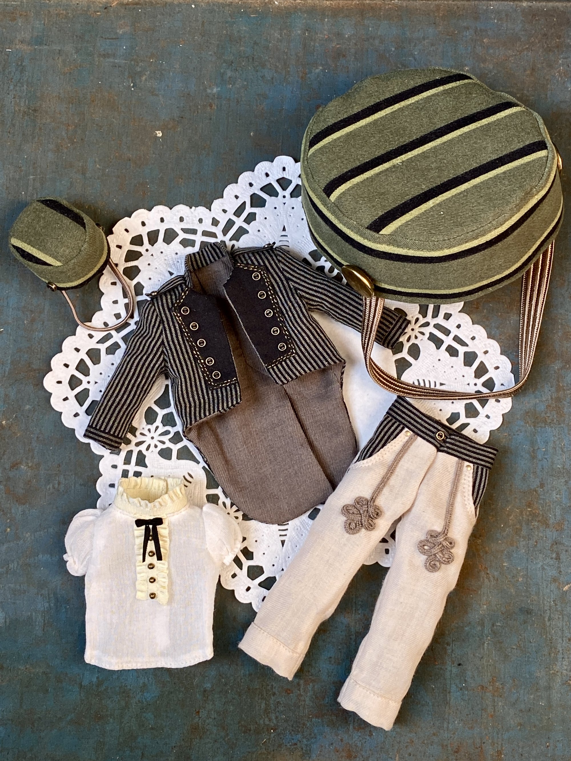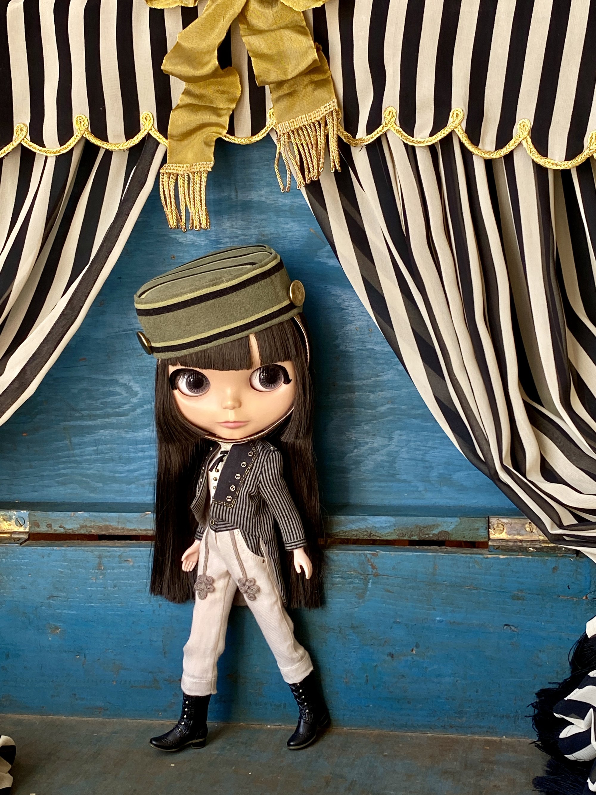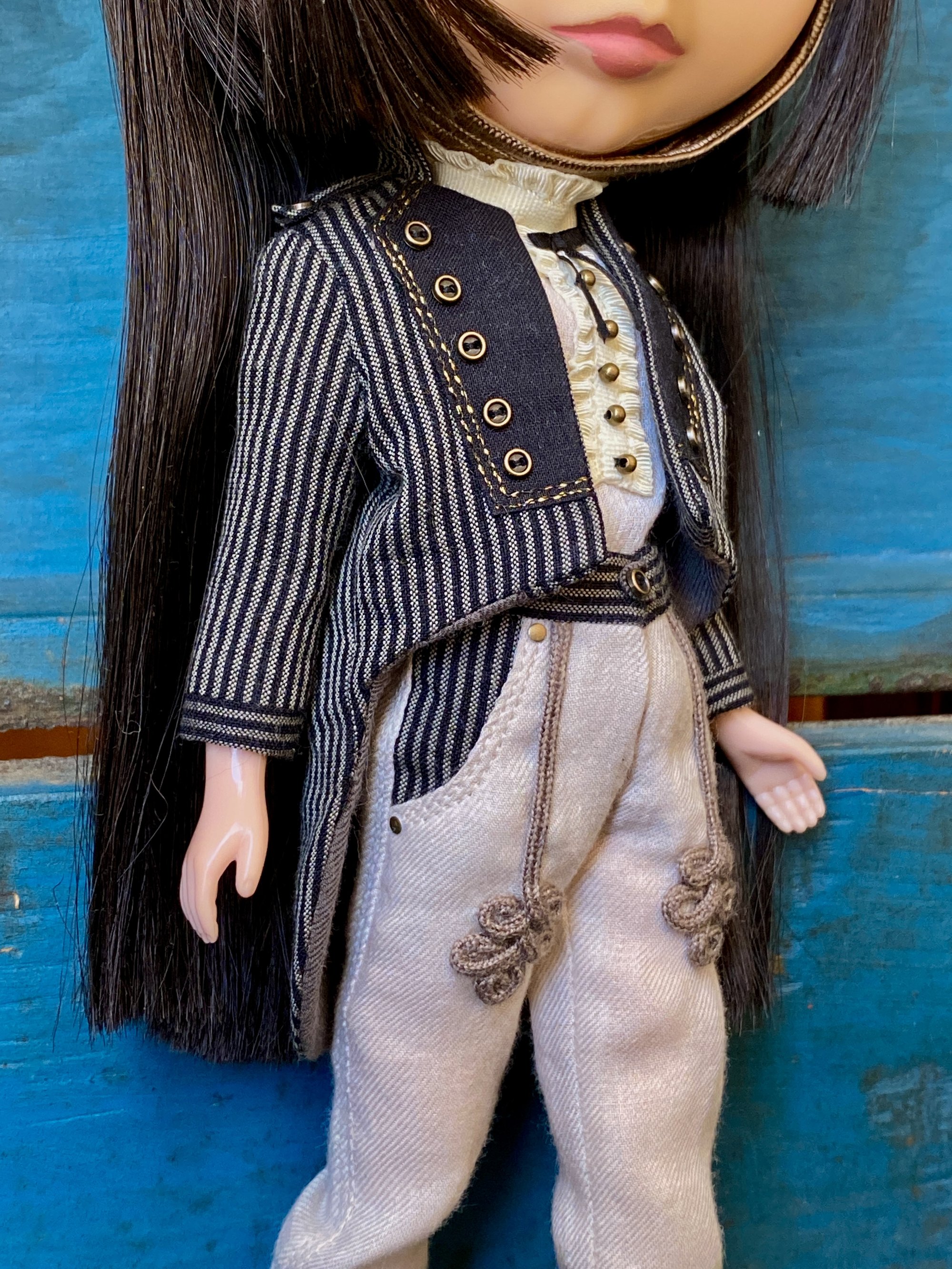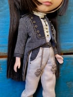 A bellboy inspired outfit consisting of fully lined tailcoat, blouse, trousers and hat, which can be made in Cherry size, please put in a note.