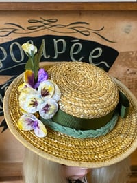 Something brightly coloured for once! Cotton velvet coat, fully lined and decorated with silk ribbon embroidery of a pansy, short sleeve dress with tiered skirt and a straw boater adorned with handmade vintage velvet pansies.